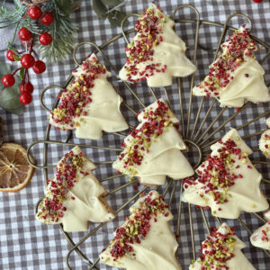 These buttery shortbread Christmas tree cookies look as good as they taste. They are simple, delicious and perfect for the festive season. This recipe uses the classic 3:2:1 shortbread ratio (flour : butter : sugar) for maximum ease, blitzed together in the food processor. Delicious as they are or finish with a layer of white chocolate and a sprinkling of freeze-dried raspberries and pistachios for a decorative festive finish. They are perfect for parties, as an edible gift or just with an afternoon cup of tea.