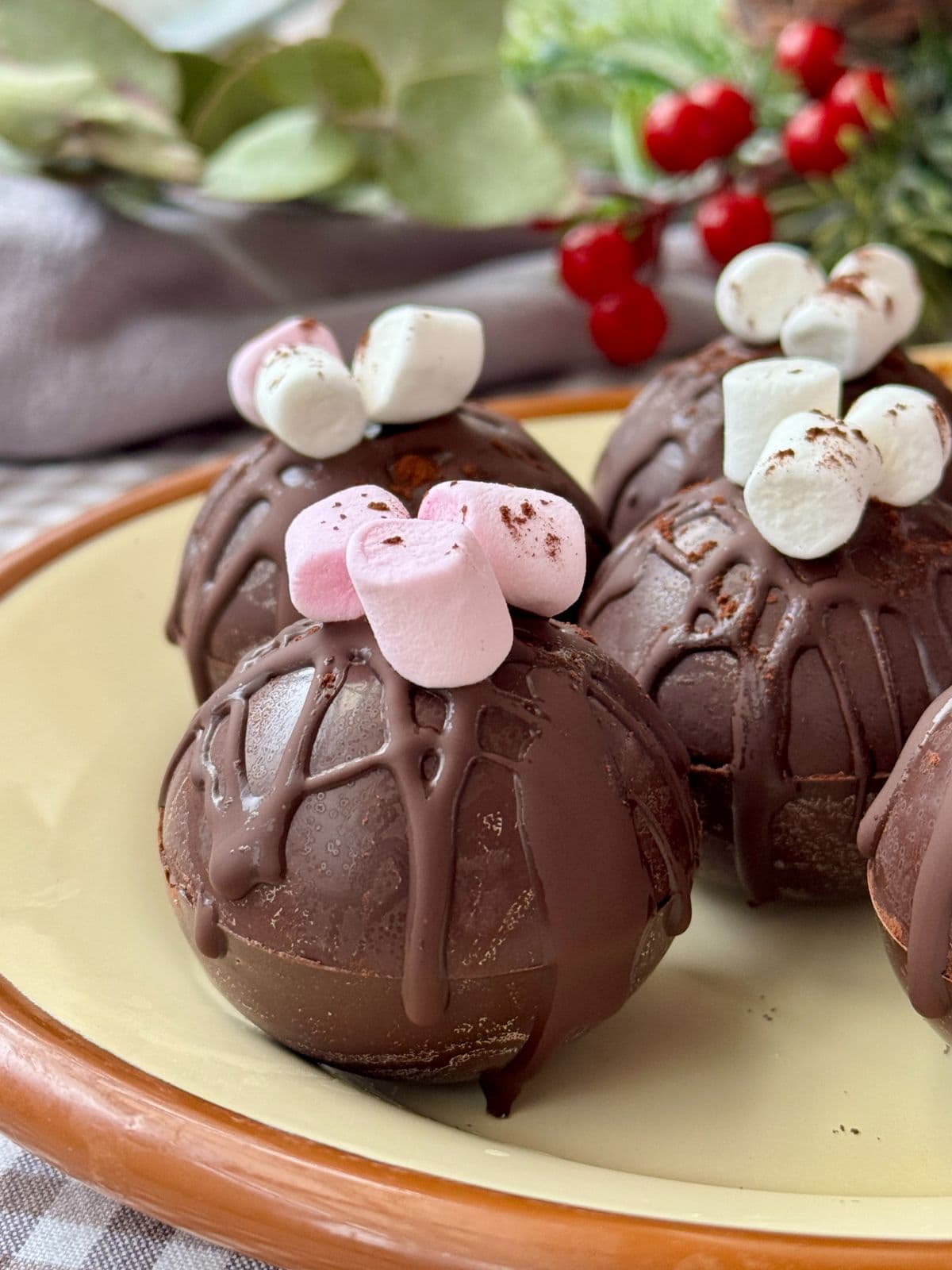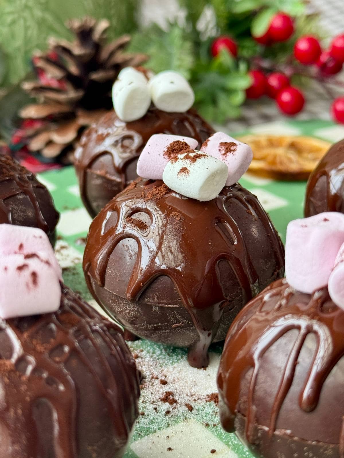 - To decorate, drizzle any remaining chocolate over the hot chocolate bombs (you may need to re-melt the chocolate) and then place a few marshmallows on top.